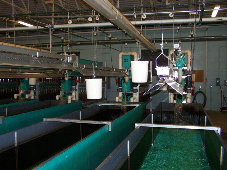 Fingerling Rearing: The hatchery has 32 standard rearing units that are 25′ x 4′ x 2.5′; interior sides of these units are dark gray, the bottom is blue. These tanks are used for all phases of walleye production: about 22 tanks are used to hold adult fish during the annual run, 13 tanks are set up for fry collection, 28 tanks are used to start walleye fry on brineshrimp. These tanks are equipped with automatic brineshrimp feeders, specialized high intensity fluorescent lighting and Loudon automatic feeders to dispense formulated diet. Close to two million fry are started in these tanks. The 4 remaining tanks are used to thin walleyes at a later date and are equipped with only Loudon feeders.