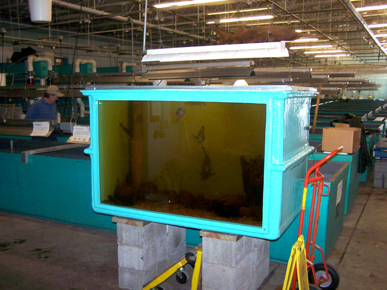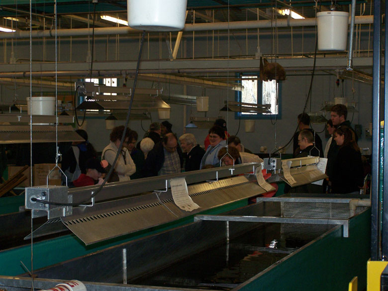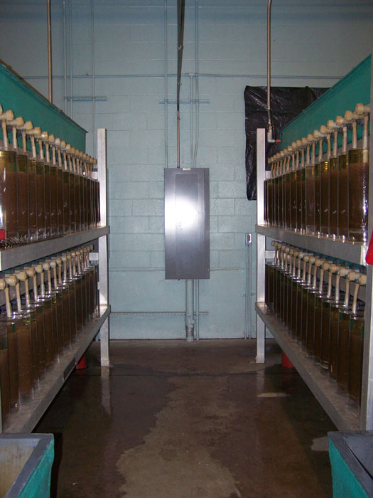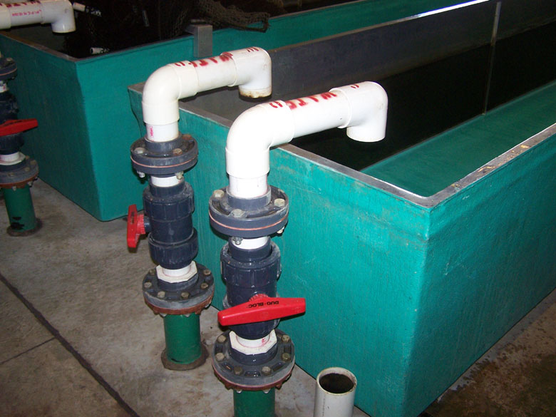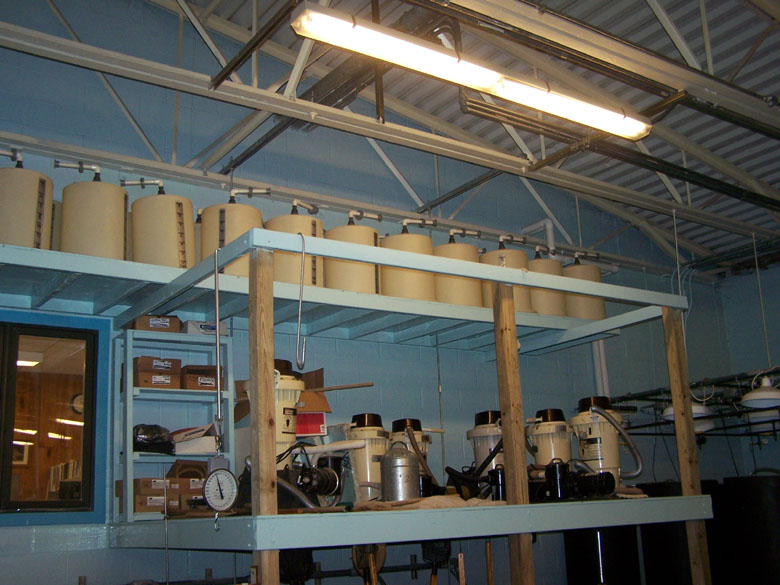 Ultraviolet Sterilization and Oxygen Injection Room: Water enters this room and passes a UV sterilization unit capable of treating 1800 GPM of water flow. This unit is effective in reducing the amount of bacteria that is present in the water supply by 99%. Dissolved oxygen can be injected into the water using aquatectors. This system is capable of increasing dissolved oxygen in rearing water (1800 GPM) by two parts per million. Use of this system can become necessary when rearing temperatures become high (e.g. 75° F+).