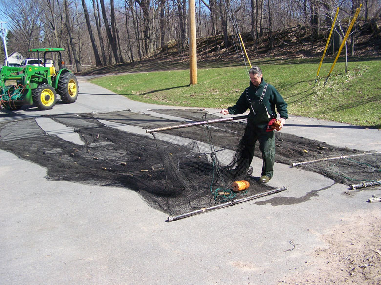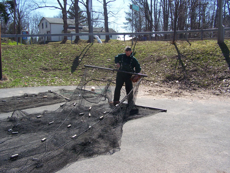 Rearing Wing: Broodstock and egg collection: Adult fish are collected in 12 – 15 trap nets set in Oneida Lake. Adults are transported to the hatchery via boat in large tubs. Tubs of adult fish are removed from the boat with an electric hoist and transferred onto dollies, then taken to the holding tanks. Fish are hand sorted as follows: male, ripe female (capable of being stripped for eggs), or hard female (fish with eggs not ready to strip). Eggs from ripe fish are collected on the day they are brought in from the lake. Hard females held in the hatchery are checked each day. When they become ripe, they are added to other ripe fish and stripped that day. To collect 400 million eggs, we handle close to 40,000 adult walleyes. This usually happens over an 8 – 12 day period after ice-out in early April.
