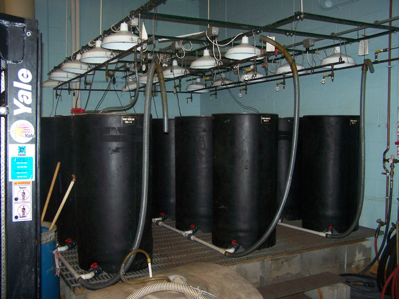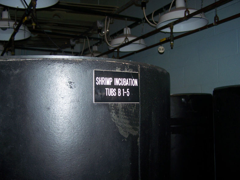 Brineshrimp Production: Fifteen – 60 gallon circular, insulated drums; each supplied with a submersible aquarium heater (for 80° – 85° F water), large volume aerators, and lights above. Air is supplied from two 3/4 horsepower air pumps.