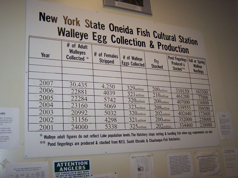 The Oneida Lake Fish Cultural Station is open from April 1 to September 30 – seven days a week from 8 a.m. to 3:30 p.m. The adult walleye collection in April is an interesting attraction to the public since large adult walleyes can be viewed at the hatchery. Tour guides will be available at this time. Group tours can be arranged by contacting the hatchery.